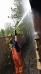 This one runs on 110V power, so we plug it into the customer's power outlet via an extension cord. So - I have a water hose running from customers water supply, going into the booster pump, and then my regular hoses from there. Bleed the water out of the lines, and turn the pump on. Then your water pressure is GREATLY increased and you can rinse up to 3 stories with a good amount of pressure. Also gives us the extra "oomph" for removing moss off concrete after treating with SoftWash solution.