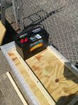 1) I cut two pieces of 3/4" plywood and attached them to the toolbox to mount the systems to. One for the battery back and AC inverter, one for the Stealth DC charger which needs to be mounted on a vertical surface for venting/cooling.